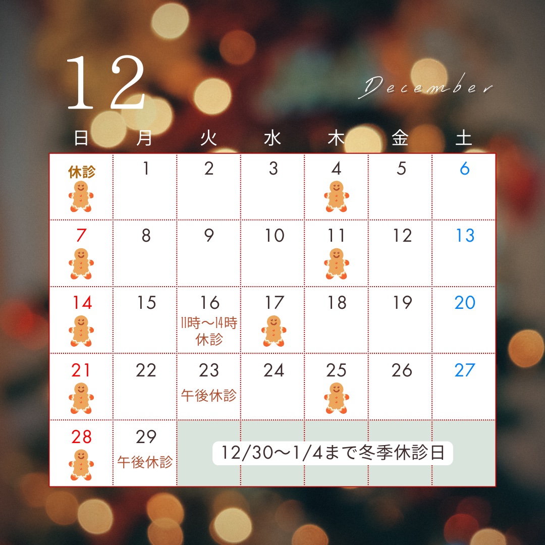 12月30日〜翌年1月4日までは冬季休診日となります。